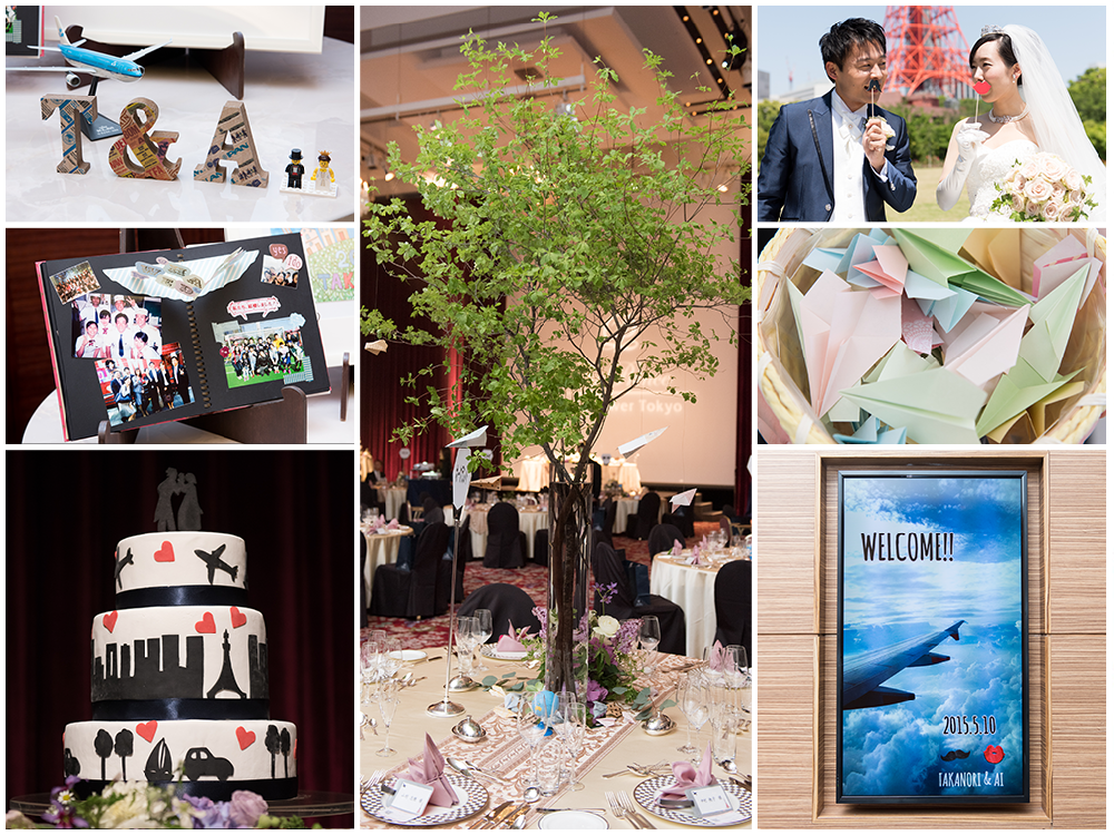 結婚式のテーマは「旅」。挙式での祝福の紙飛行機シャワーや、ウエルカムボード、ウエディングケーキ、スーツケース型の花器、そして装花の中にも紙飛行機や地球儀を散りばめ、とことん「旅」を追求した。ゲストの席札の代わりにはラゲッジタグを用意。ゲストと一緒に旅を楽しむような雰囲気作りにこだわった。特に紙飛行機のシャワーを体験したゲストからは、「今まで見たことない!」と大好評だった。
