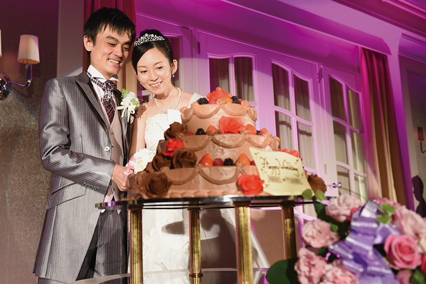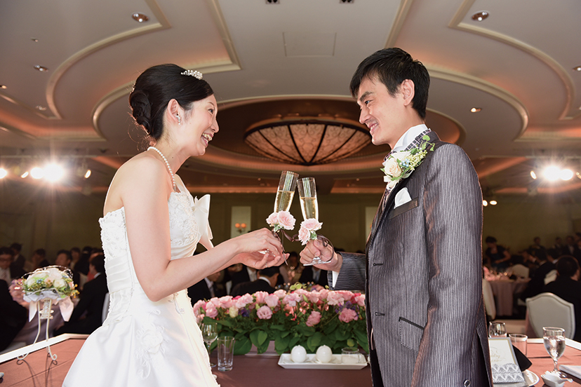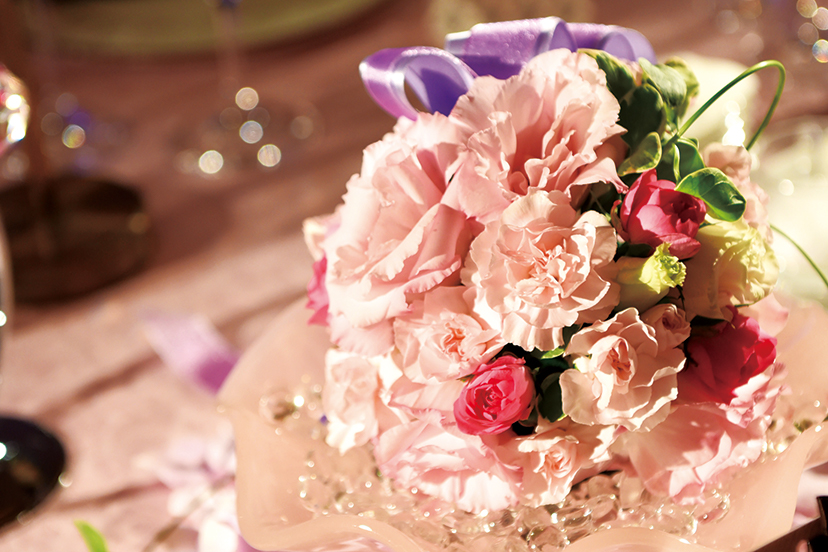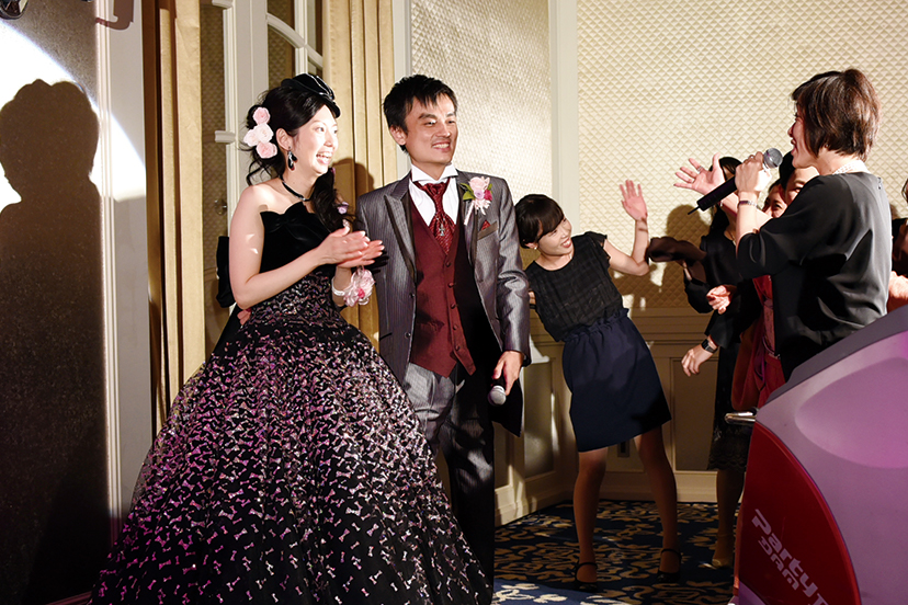 披露宴は邸宅風バンケット「扇」の雰囲気に合わせ、可愛らしくピンクと紫でコーディネート。ウエディングケーキには、サプライズでキャラクターをのせる遊び心も。料理はふたりが一番美味しいと思った中国料理を特別メニューにアレンジ。お酒が大好きなNさんのこだわりでドリンクメニューもオリジナルにし、ゲストから大好評だった。笑いありハプニングありで盛り上がったカラオケ大会も一生の思い出に。楽しい時間を過ごし、親族や友人とのつながりを感じる特別な一日となった。