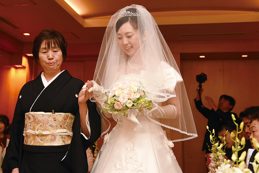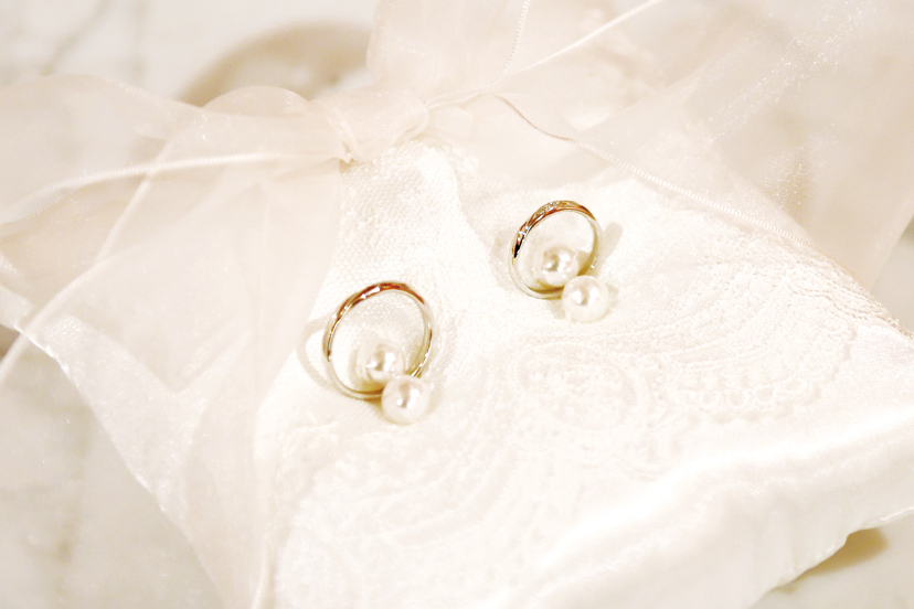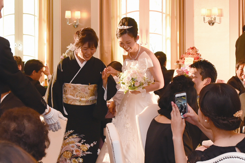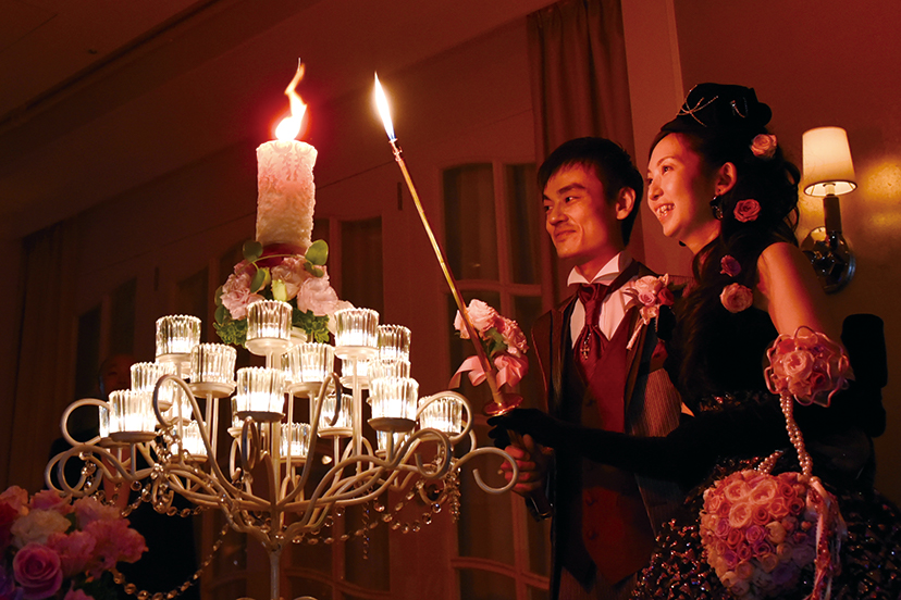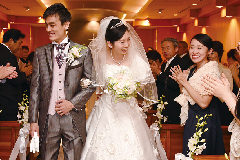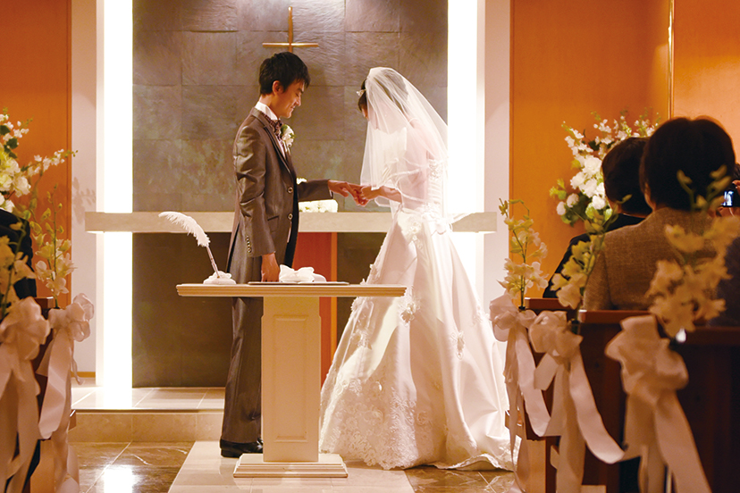 日本初のホテル内チャペルでのセレモニー。ゲストが見守る中での指輪の交換