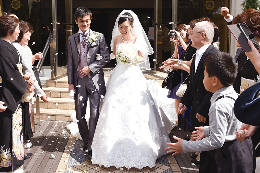 青空のもとのフラワーシャワー。ゲスト全員から祝福の声がかかる
