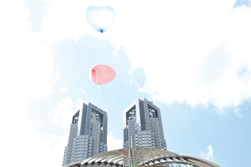 ハート型のバルーンを笑顔で見送る幸せいっぱいのふたり