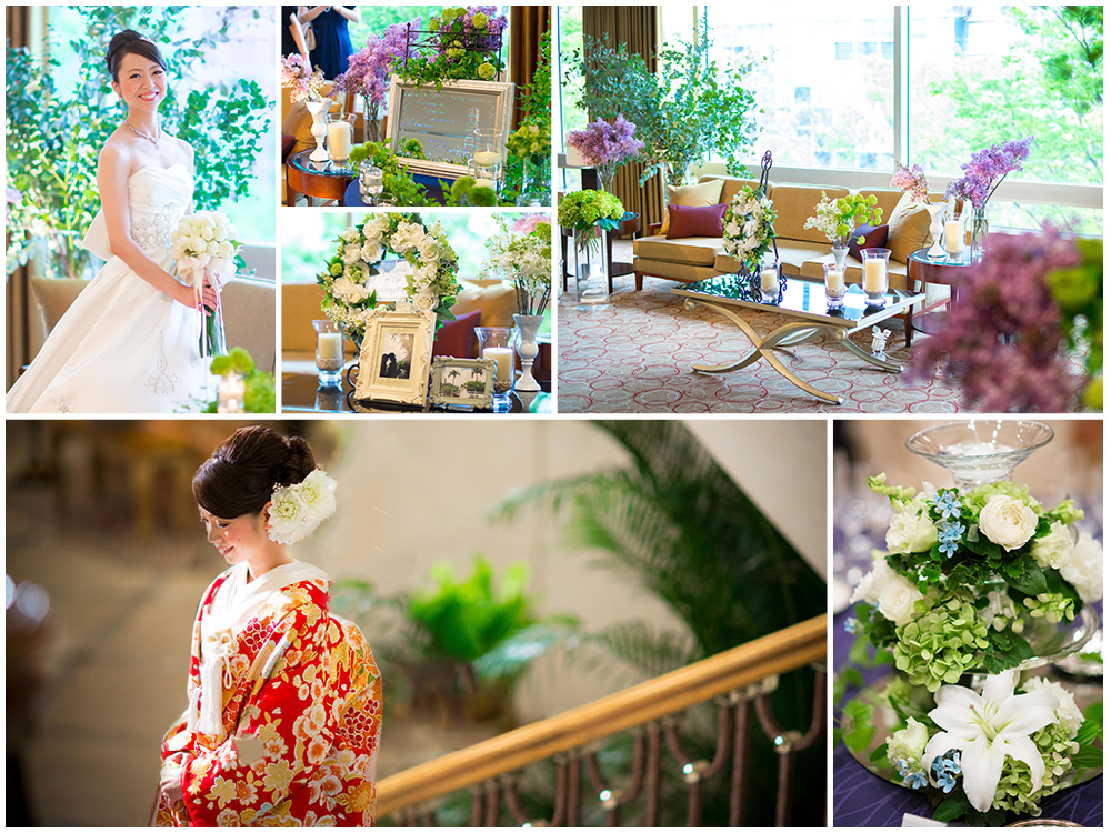 鮮やかな色打掛とはうって変って、清楚な白のドレスで再入場。職場の同僚による余興や心温まるメッセージをもらい、感極まるシーンも。披露宴後は二次会も同ホテル最上階で行われ、宿泊はスイートルームで。ホテルステイならではの優雅なウエディングが実現した。