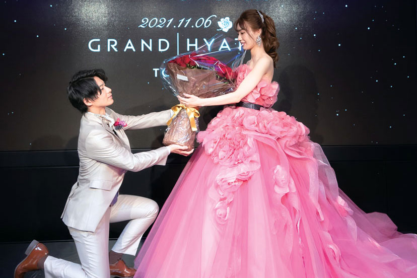 共通の友人の紹介で知り合ったふたり。花が大好きな新婦へ、12本の赤いバラでダズンローズのプロポーズ。結婚式は素敵なフォトスポットも多い「グランド ハイアット 東京」に決めた。ドレスは70着を試着。人気のヘア&メイクアーティストや映像クリエイターを一年前から予約するなど、最高の日にするため、一つひとつこだわって準備した。ドレスに合わせてブーケは3つ。大好きなピンクは、シックな色調の空間に映えるよう、ポイントカラーとして小物やドレスにセレクトした。当日はサプライズも用意。新婦からは海外在住で参列できなかった新郎の親友からのビデオレターを。新郎からは100本のバラの花束をプレゼントした。また披露宴が行われた11月が誕生日のゲストが、新郎の父を含め7人もいたことから、バースデープレートのサプライズも。オープニングムービーや料理なども喜んでもらえ、家族や友人、新郎新婦お互いに感謝を伝えるアットホームな祝宴に。そして大好きなもの、大好きな人たちに囲まれて、夢のような一日を叶えた。