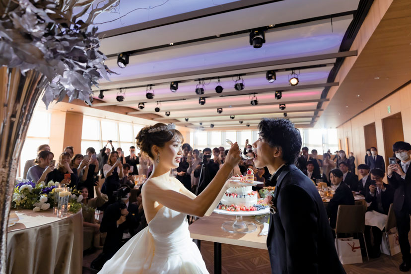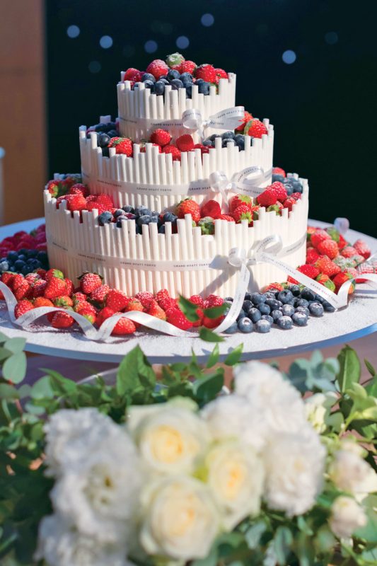 ウエディングケーキは憧れの「グランド ハイアット 東京」オリジナルの、チャペルをモチーフにしたデザイン。