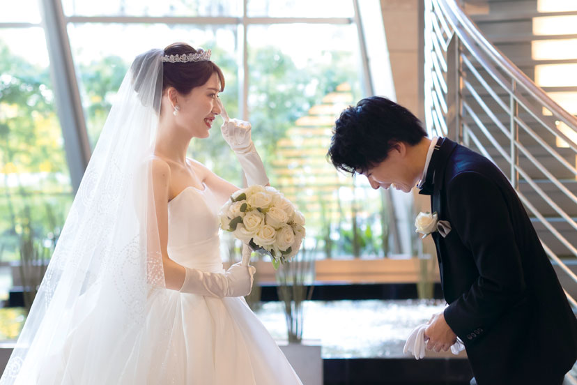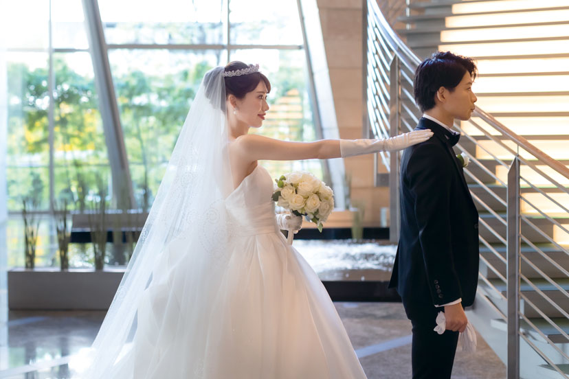 吹き抜けのロビーに煌めく光の階段は人気のフォトスポット。優しい光に照らされ、見つめ合うふたりの印象的な一枚。