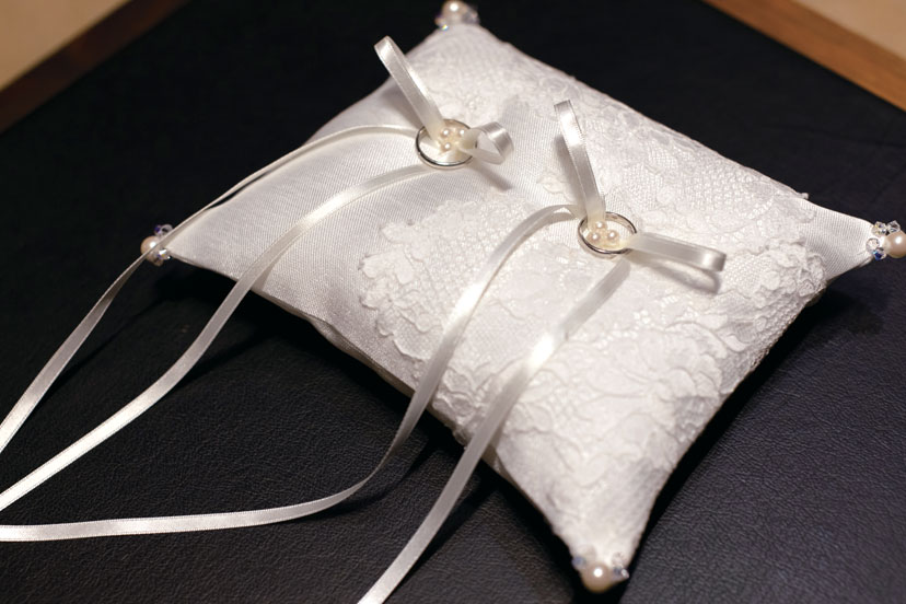 ふたりの名前と日付の入ったリングピローは新婦母の手作り。