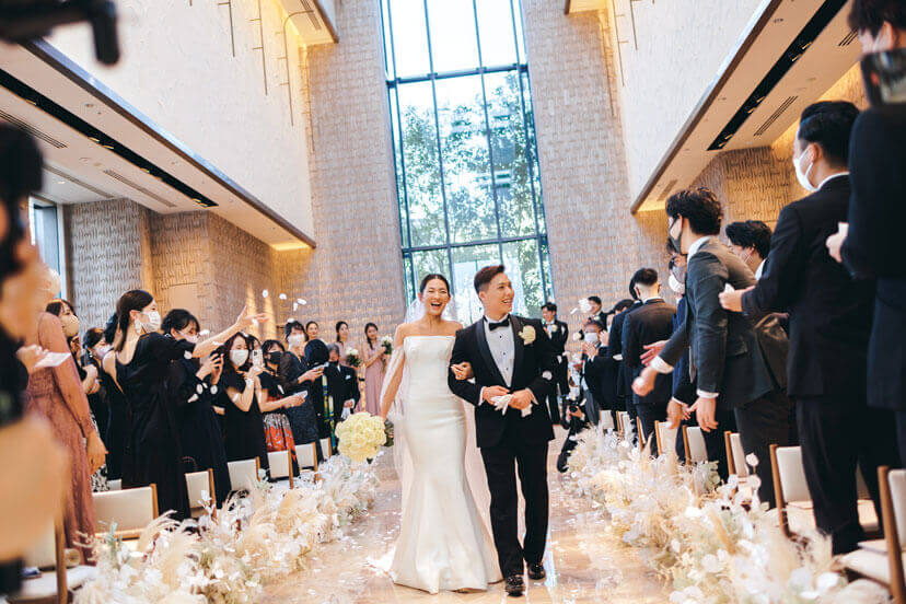 ハートフルな祝福に包まれてフラワーシャワーの中を退場。