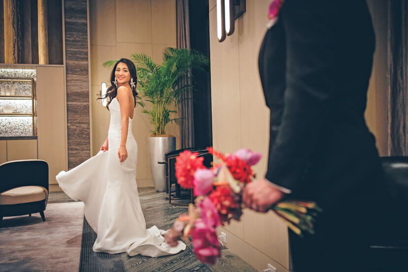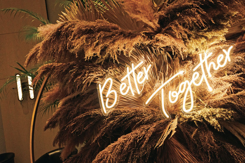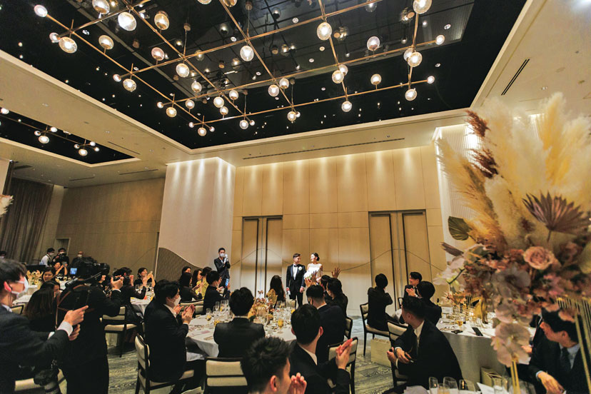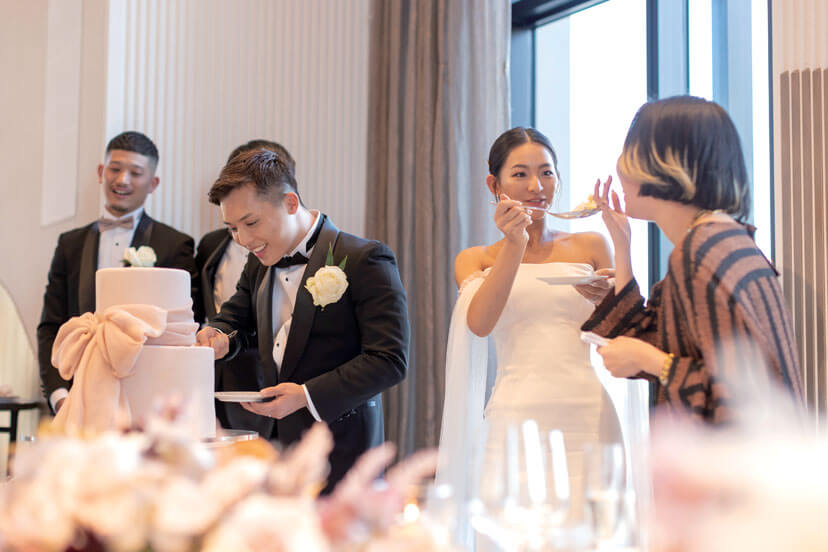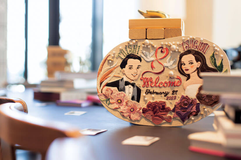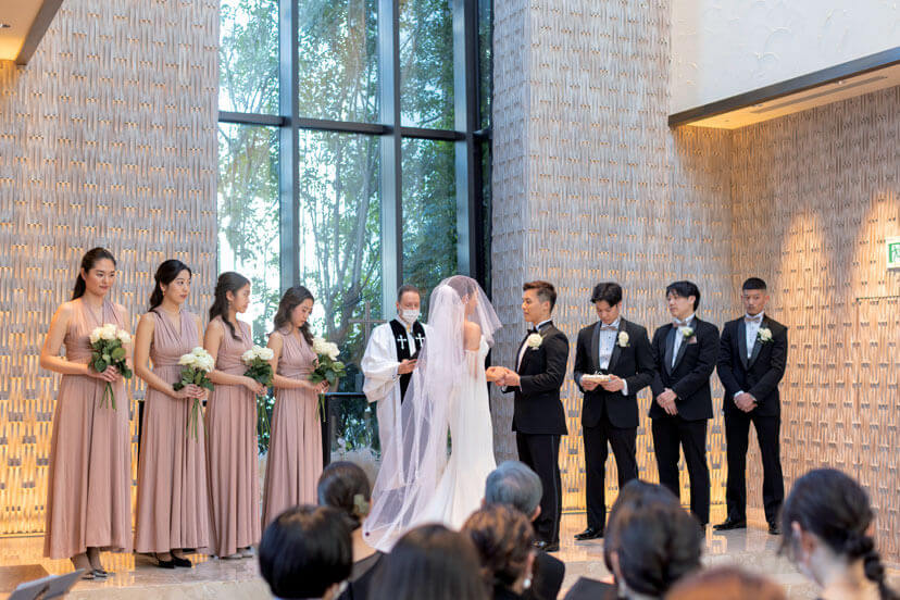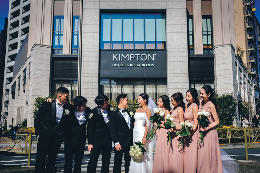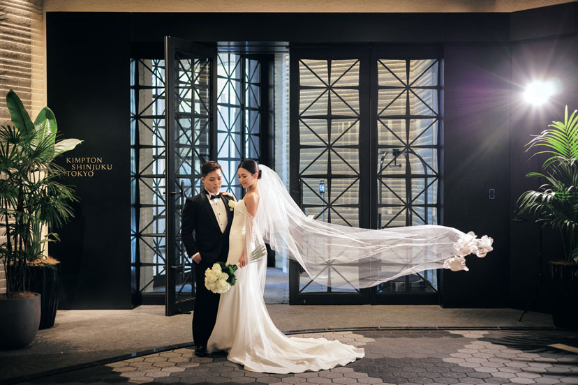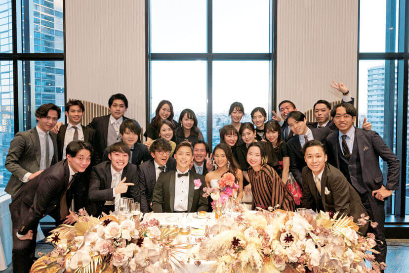 大学で出会ったふたりは、常に大勢の仲間との時間を楽しんできた。プロポーズも新郎の親友たちが協力し、交際5年で入籍。結婚式は高級感がありながらリラックスした雰囲気と、海外スタイルも叶う自由度の高い「キンプトン新宿東京」に。関西、東京と出身は違うふたりだが、共通の友人も多く「一緒にいる時間が楽しい!」とゲストに感じてもらえる結婚式を目指した。招待時からオリジナルウェブサイトを活用し、出欠席の連絡や当日の案内など、結婚式へのワクワク感を演出。家族や知人の手作り小物やムービーなども、心温まる祝宴を彩った。またゲストが料理や会話を楽しめるよう余興をカット。ふたりはもちろん、ゲスト同士もテーブルを行き来して、おしゃべりや写真撮影などで盛り上がった。両親たちからは「こんなに良い友達に囲まれている姿を見みることができてよかった」、友人たちからも「自分たちもここで挙げたい!」とうれしい賛辞も。コロナ禍で3回の延期と会場の変更。そして竣工したばかりのキンプトンに出会い、理想以上の一日となった。