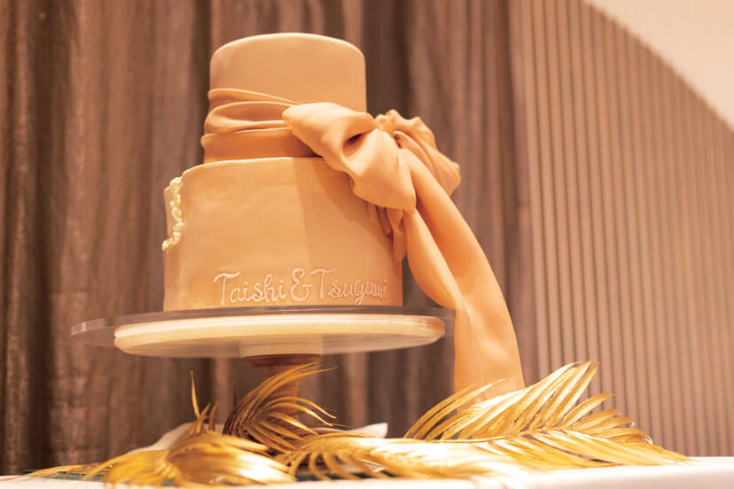 大きなリボンが印象的なピンクのウエディングケーキ。