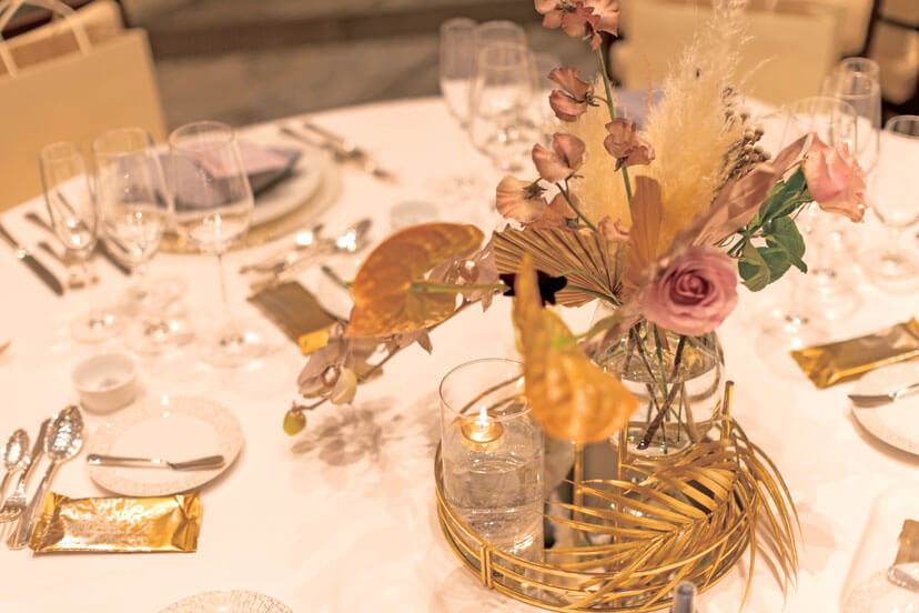 大好きなアンスリウムと胡蝶蘭をテーマカラーのくすみピンク&グレー&ゴールドでアレンジ。高さや奥行きを出した4種類のコーディネートでテーブルごとに印象を変え、海外のガーデンウエディングのような雰囲気に。