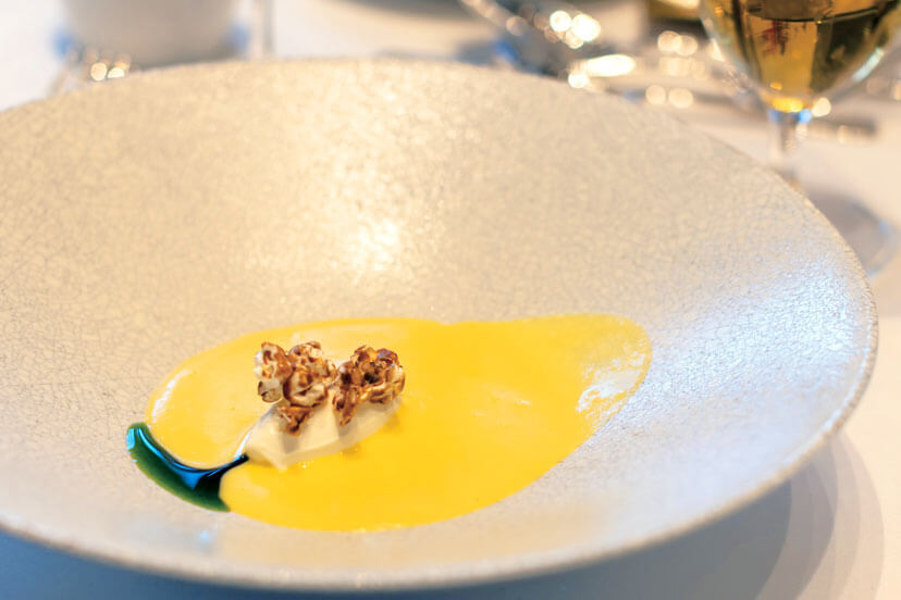 ポップコーンがのったコーンスープ。ゲストの目の前でスープを注ぐスタイルも楽しい演出に。