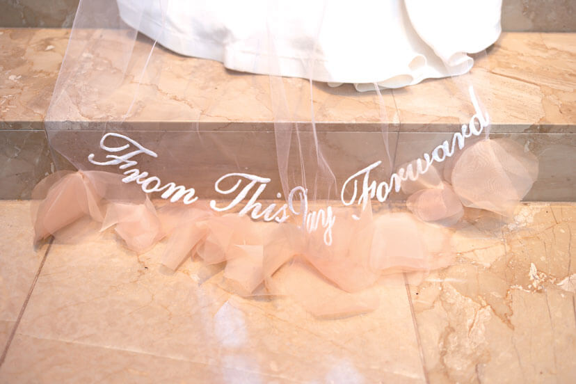 誓いの言葉の一部を刺しゅうした世界にひとつのベール。くすみピンクの花びらモチーフがシンプルなドレスに映える。