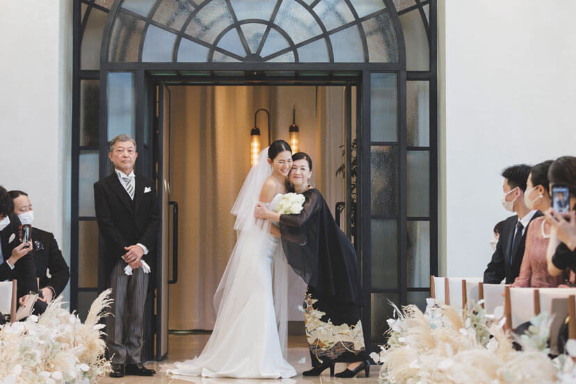 ベールダウンの際、笑顔溢れる母娘のハグがゲストの感動を誘う。