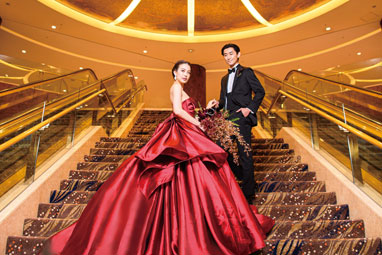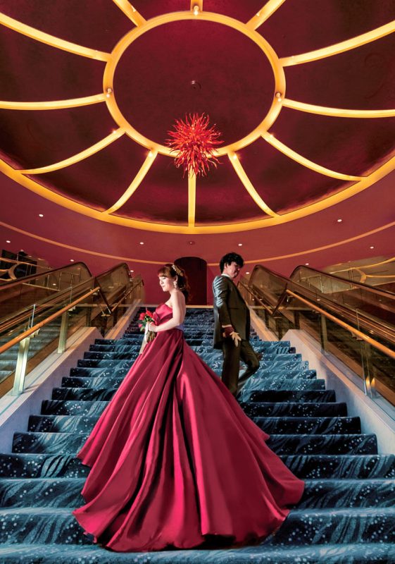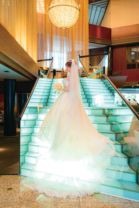 ロビーフロアの光の階段に美しく映える、長いトレーンのウエディングドレス。