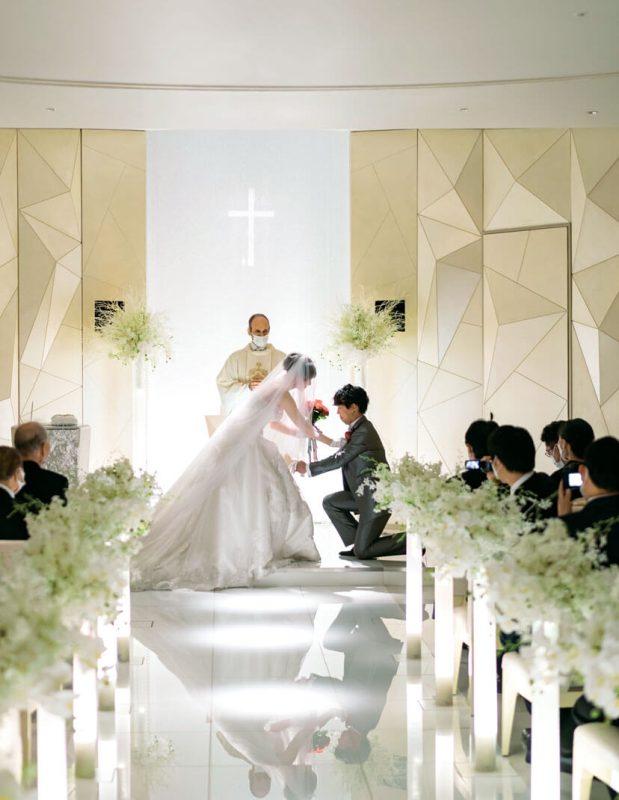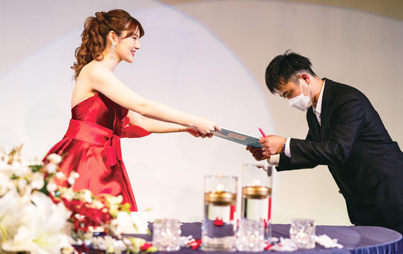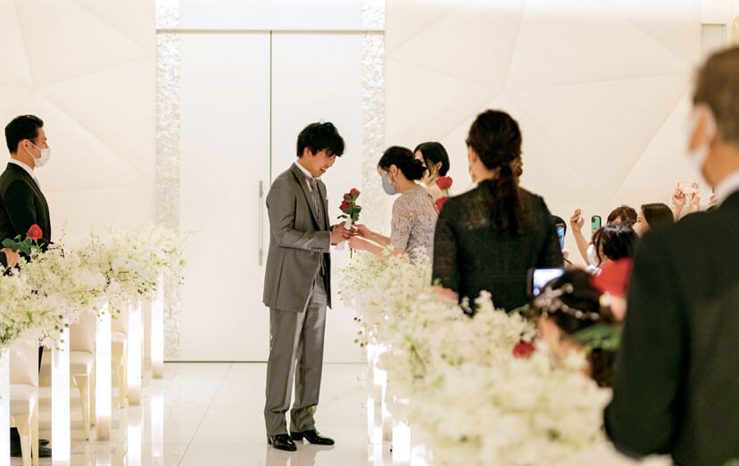 束ねたバラを受け取った新婦が、その中の1本を新郎の胸元に挿して誓いが成立。