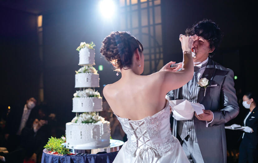 新婦の懐妊などの事情により短期間で結婚式の準備を行うことになったふたり。以前に宿泊したときにスタッフのサービスが良かったことから「ANAインターコンチネンタルホテル東京」のウエディングサロンを訪れた。ふたりの想いを細やかに聴きとって、すぐに提案してくれるプランナーの対応力や真摯な姿勢が心に響き、門出の舞台に選んだ。新郎側のゲストの多くが遠方から訪れるので安心して宿泊してもらえることも魅力だった。プランナーを中心にプロフェッショナルなスタッフも総力をあげてふたりの準備を支えた。パーティは7mの天井高で開放的な会場「プロミネンス」にて。プロジェクションマッピングを使ったダイナミックな演出により幻想的かつ壮麗な印象に。お色直しのドレスは花嫁がこだわった「アントニオ・リーヴァ」の真紅のドレス。大人の雰囲気にコーディネートした広々とした空間に美しく映えた。笑いあり、涙あり、家族やゲスト全員と喜びを分かち合えて最高の一日に。スタッフ全員にも心から感謝したふたり。ホテルはふたりにとって特別な場所となった。