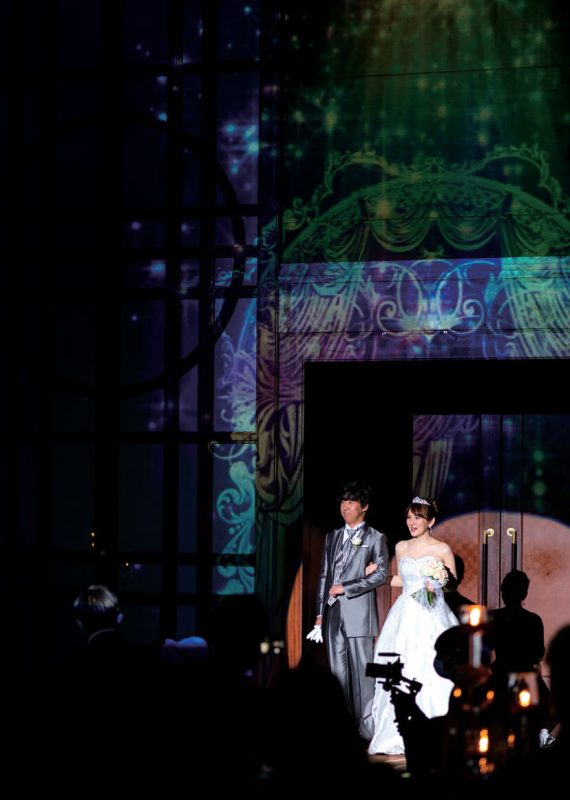新郎新婦入場時にはプロジェクションマッピングの演出でより盛り上げて。開放的な空間がロマンティックな雰囲気に。