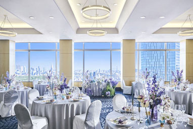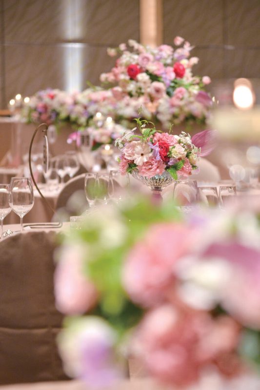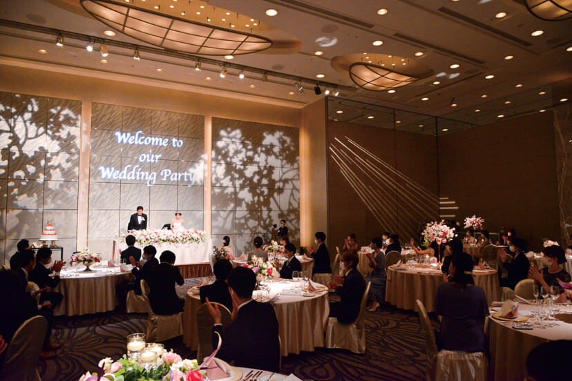 披露宴会場はホテルのメインバンケット「ボールルーム」で。天井が高く、ダイナミックで優雅な大人の雰囲気が漂う空間。