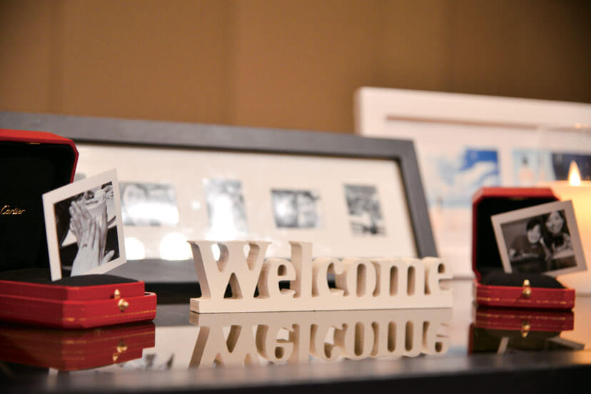 指輪のケースを写真立てにしてふたりの記念写真をウエルカムスペースに。