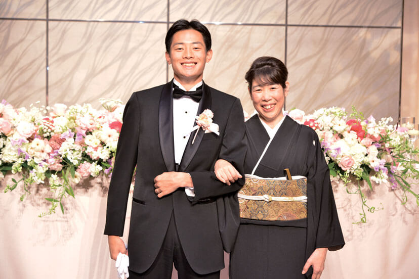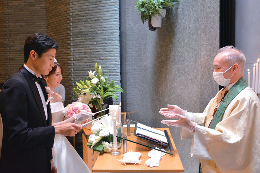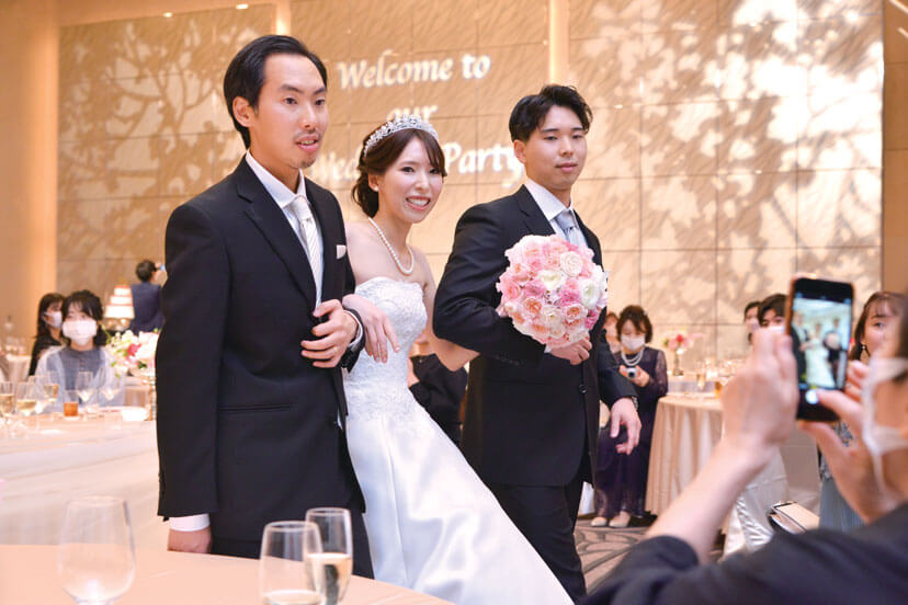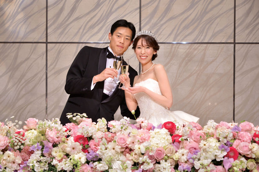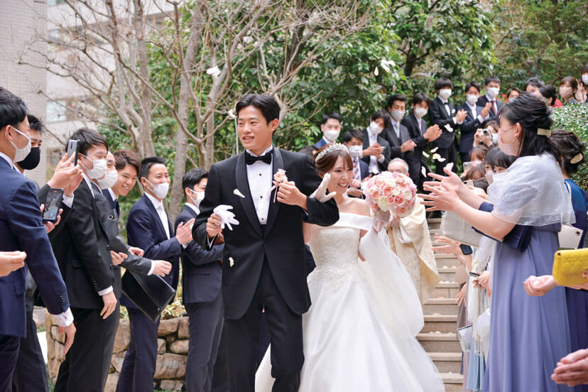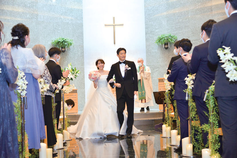石造りの教会の神秘的で厳かな雰囲気と、壮大な空間と最新鋭の照明設備を備えた上質なバンケットの雰囲気、そのギャップもこのホテルの魅力だったというふたり。セレモニーは専任のマーク牧師による正統なキリスト教式で執り行われ、ユニティキャンドルの点火など家族の絆を大切にした温かな演出で感動的な誓いに。祝福のフラワーシャワーでは、夫婦になった幸せを噛み締めた。パーティは80名を超えるゲスト一人ひとりに寛いでもらい、コロナ禍を吹き飛ばすような明るい気分になってもらいたいと、春爛漫の装花で会場をコーディネート。味とボリュームにもこだわったという総料理長オリジナルのフランス料理でゲストをおもてなしした。お色直し入場後はテーブルラウンドで記念撮影を。友人スピーチに涙する感動の一幕もあり、和やかな時間となった。特別な依頼をするまでもなく万全な感染対策がとられるなど、改めてホテルのホスピタリティ意識の高さを感じたという新婦。大切な人たちの笑顔が溢れる、記憶に残る特別な一日を叶えられた。