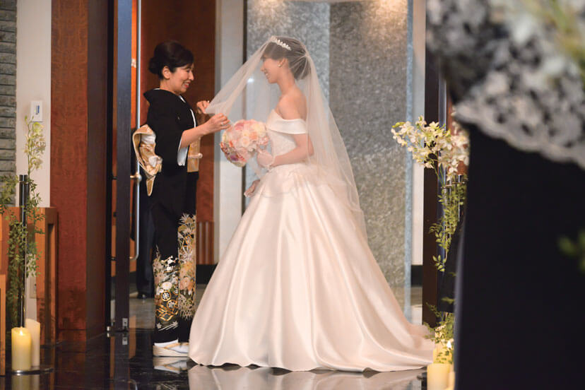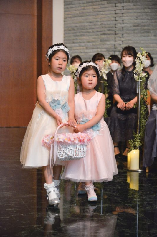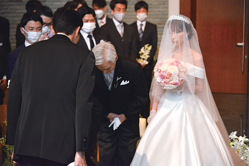 新婦父のエスコートでバージンロードを一歩一歩進み、父から新郎へエスコート役が引き継がれた。