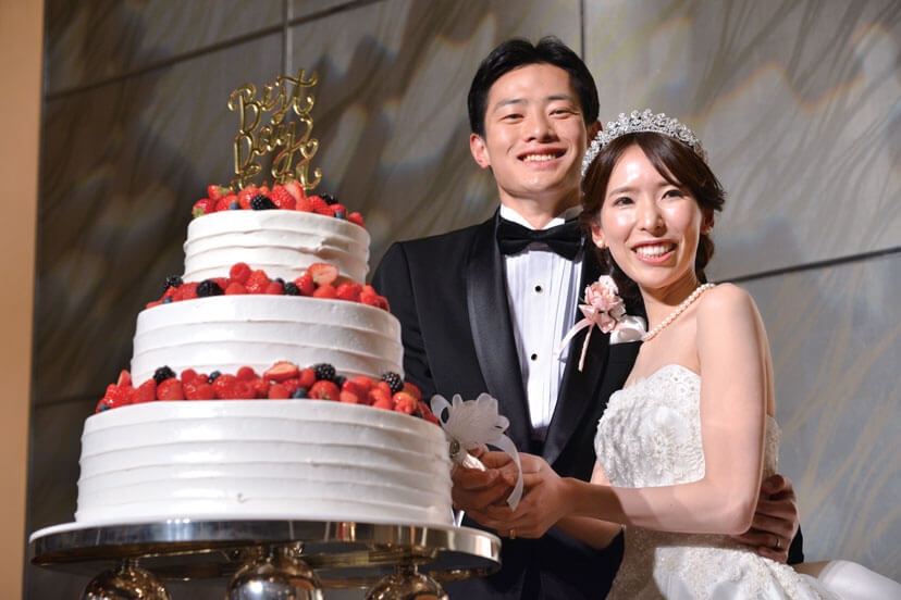 フルーツたっぷりのケーキをふたりで入刀。ファーストバイトでは新郎友人たちが盛り上げてくれた。