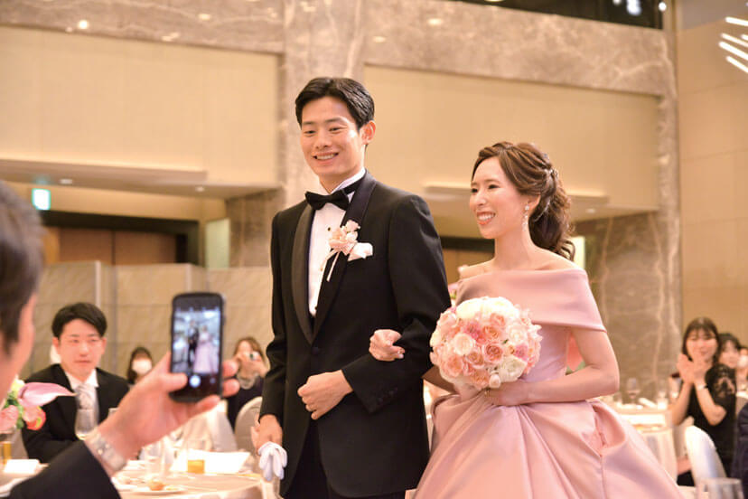 テーマの春を感じさせるニュアンスピンクのドレスにチェンジして登場。テーブルラウンドでゲストと会話や写真撮影を楽しんだ。