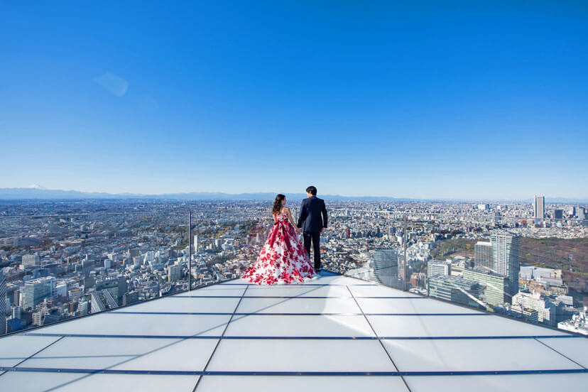「セルリアンタワー東急ホテル」で結婚式をするカップル限定の前撮りロケーションフォト。「渋谷スクランブルスクエア」最上階の展望施設「渋谷スカイ」で絶景ビューを背景に特別な一枚を残せた。