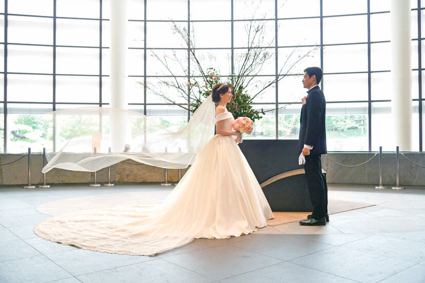 理想の正統派ホテルウエディングを叶えたふたり。ドレスは王道のシルエットでエレガントに。挙式前のひとときホテル内でのロケーション撮影を楽しんだ。