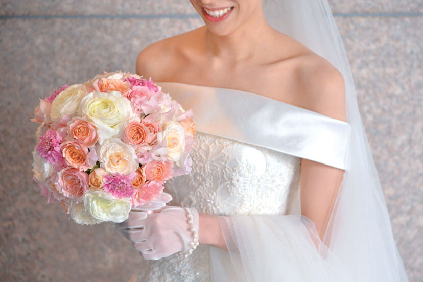 春色のラウンドブーケはカラードレスにも似合うデザインに。