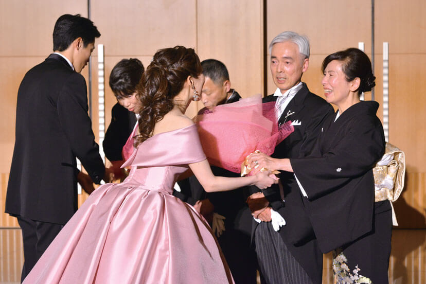 両親へ感謝の手紙を朗読後、花束と旅行ギフトを進呈。ゲストからも祝福の拍手が贈られた。