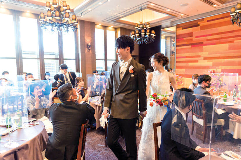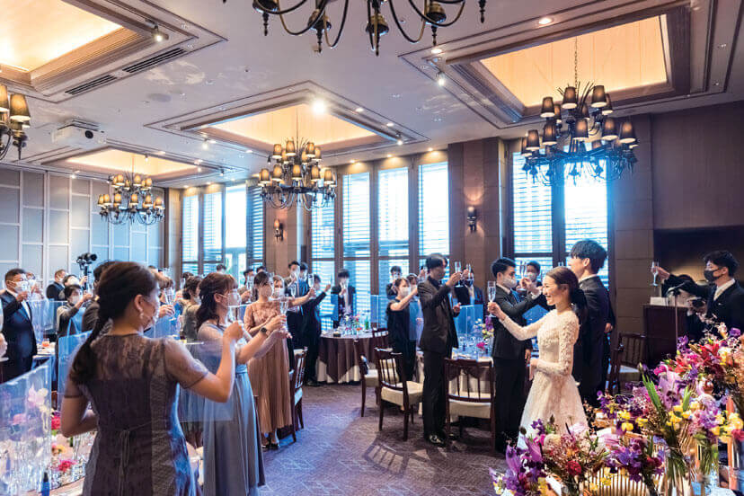 披露パーティ会場に選んだのは、シャンデリアなどの装飾がエレガントな「ザ オリエンタルルーム」。陽光に輝くシャンパングラスを片手に祝杯をあげ、披露宴がスタート 。