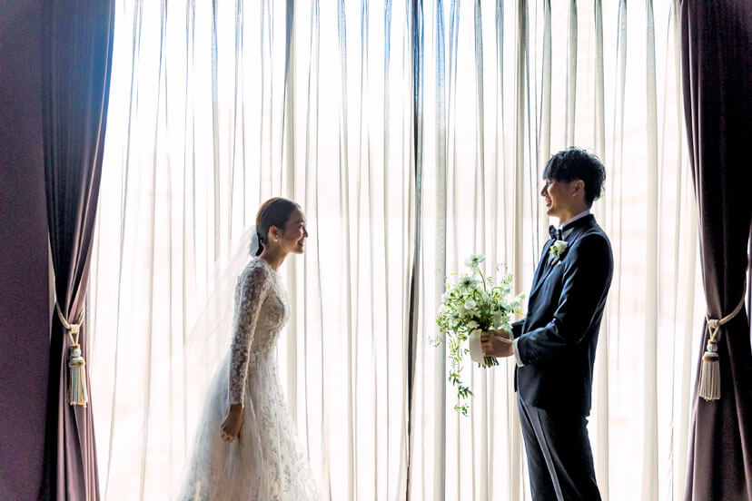 ドレス選びに同行できなかった新郎に、美しいドレス姿を初披露したファーストミート。少し照れたような新郎の表情に、新婦の笑顔がこぼれる幸せのひととき。