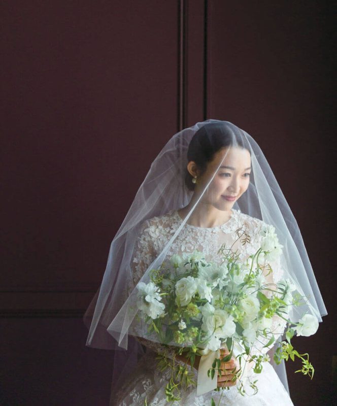 ロイヤル感溢れるドレスに、グリーンで動きをつけたブーケのナチュラル感が、自然素材で造られたチャペルにぴったり。