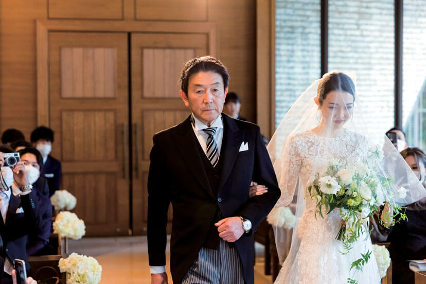 ハープの調べが響き渡るなか、父と歩むバージンロード。陽光が降り注ぐチャペルで、ゲストの笑顔に見守られながら心温まるセレモニーを。