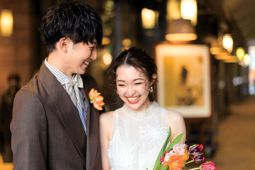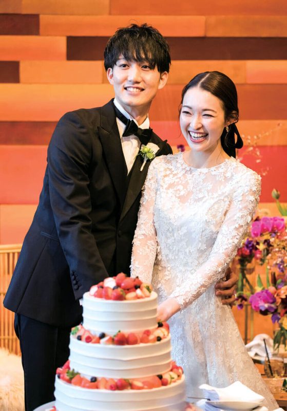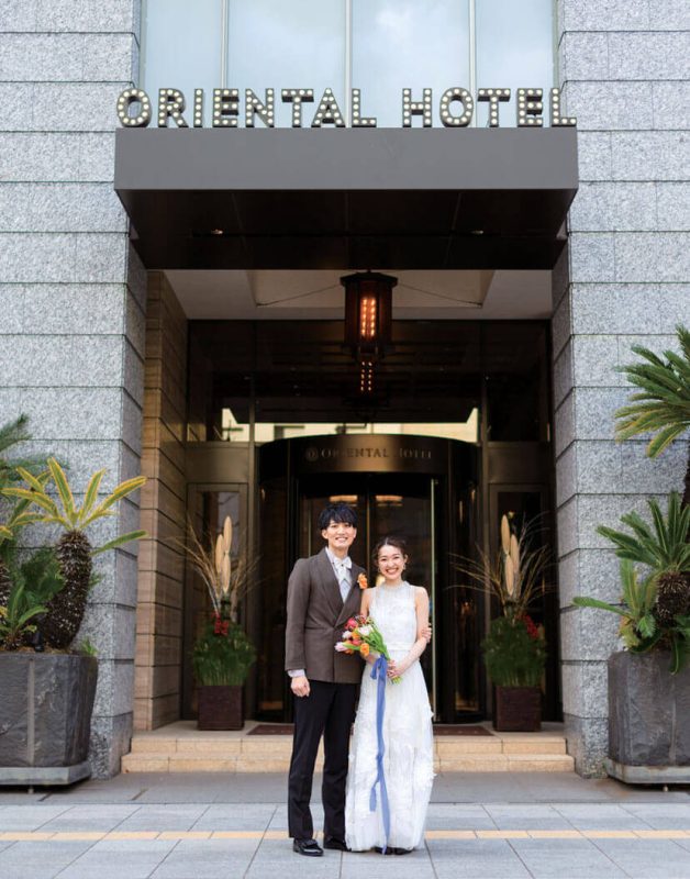 学生時代、それぞれの高校で陸上部に所属し、大会で新郎が新婦に一目惚れしたのが出会い。就職を機に交際をスタートし、4年目のクリスマスイヴにプロポーズをした。新婦姉の結婚式で訪れた「オリエンタルホテル 神戸・旧居留地」の、高級感とお洒落な雰囲気にここでの挙式を決定。ゲストに楽しんでもらえる、ふたりらしい結婚式を考えた。一番のこだわりは個性溢れる装花。センスフルなフローリストに、新婦の好きなオンシジウムを入れた会場装花や、花材を活かしたブーケを依頼したところ理想以上の仕上がりに。ドレスも挙式はクラシカルなデザイン、お色直しでは膝下が透けたドレスにカジュアルな小物を合わせて、印象的なドレスチェンジを成功させた。またホテルの名物料理「フォアグラ寿司」は、ゲストに振る舞いたかったという逸品。至福の料理の数々も大好評だった。色鮮やかな会場装花は、写真映えはもちろん和やかな祝宴の雰囲気作りにも。初対面のゲスト同士が仲良くなるほど「今までで一番楽しい結婚式だった」とうれしい感想が次々と届いた。