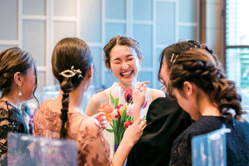 ゲストとの笑顔溢れるひととき。披露宴後、装花は女性ゲストへプレゼント。