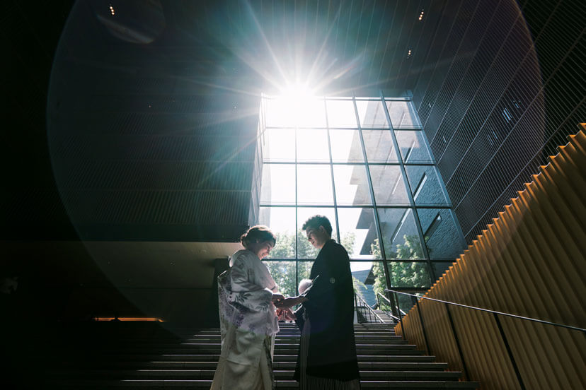 「ザ・サウザンド京都」の代名詞でもある大階段でのフォトシューティング。ドレスのシルエットが美しく映えたクールでスタイリッシュなショットに。