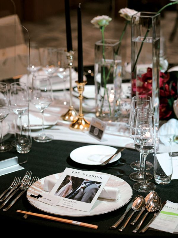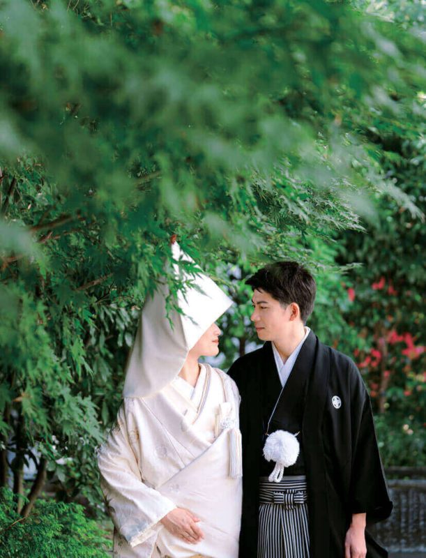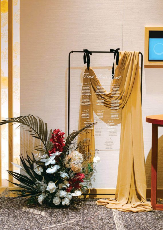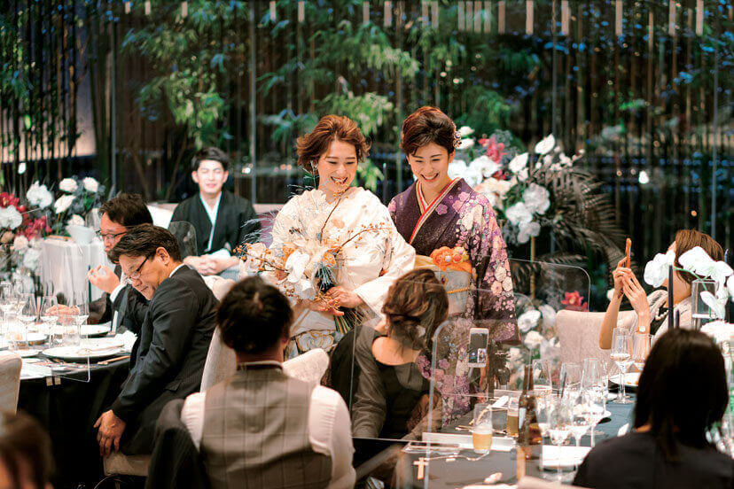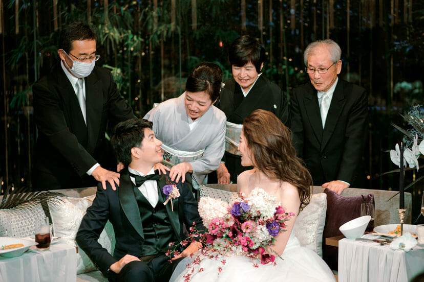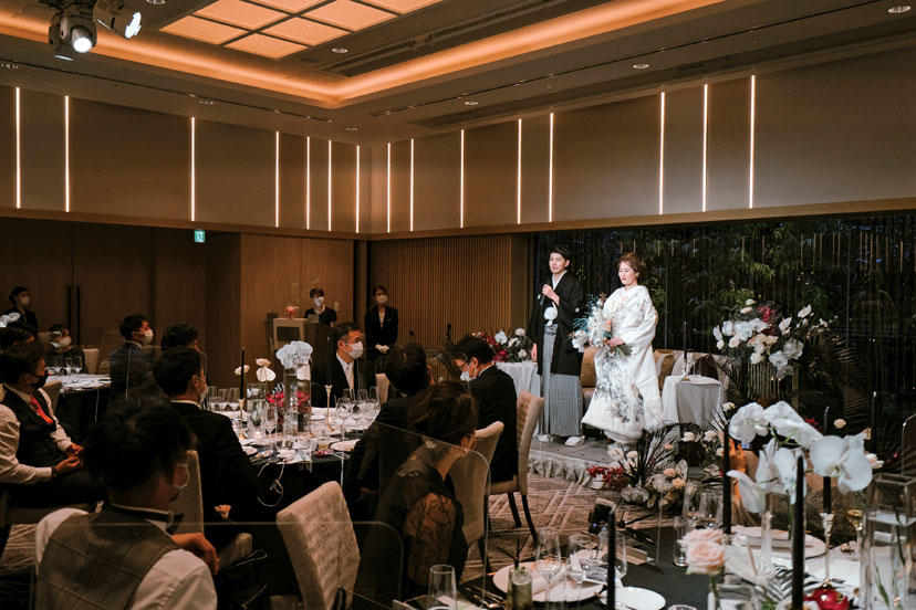 結婚を決めた後にコロナ禍となってしまい、挙式の日取りを延ばすことに。緊急事態宣言が開けてちょうどアルコールの提供もできるようになった時期に晴れて挙げることができた。前日にチェックイン、当日は客室にて朝からゆったりした時間のなかで花嫁支度を。普段から着物をまとうことが多いので、白無垢で結婚式を挙げたかったという花嫁。チャペルでも和装で登場したふたりはゲストにとっても新鮮な印象。花嫁の友人たちから「あなたらしいね」と好評だった。挙式では、お互いの両親と手を取り合って感謝を伝え、言葉以上に表情で心が通じ合った。ふたりが目指したのは、全員と語らい、寛ぎながら楽しむウエディング。歓談の時間を長く取りたかったので、余裕あるタイムテーブルとした。シンプルな会場をスタイリッシュな装花で演出。大人の雰囲気漂う空間で、料理とワインを味わいながら会話に花を咲かせられた。家族はもちろん、今までの人生で出会ったたくさんの人たちが一堂に会し、祝福してくれたことにも、サポートし続けてくれたスタッフにも感謝の気持ちが溢れた忘れられない一日に。