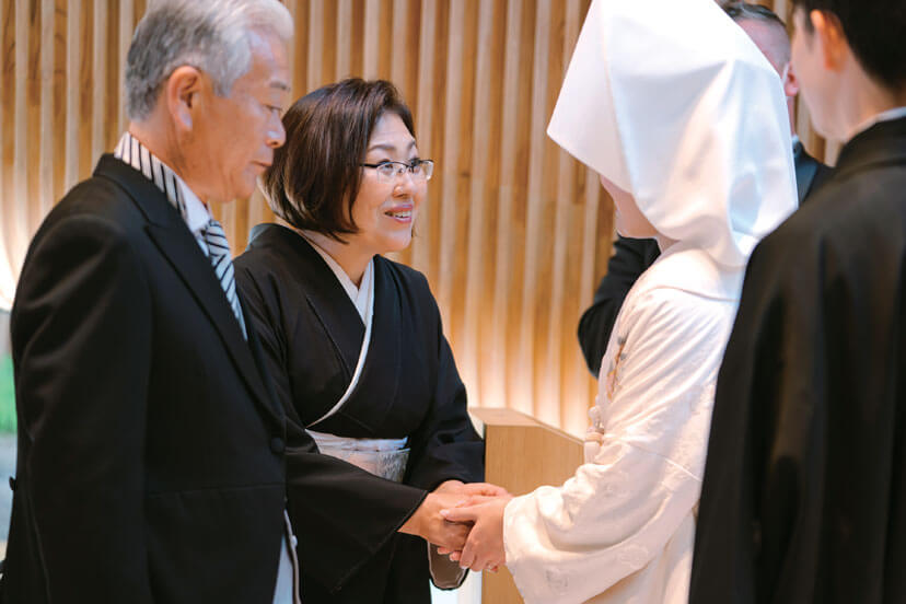 挙式中、言葉にできない感謝の気持ちを込めてお互いの両親と手を取り合うセレモニー。喜び溢れるなかに一抹の寂しさが漂う両親の表情が印象的。
