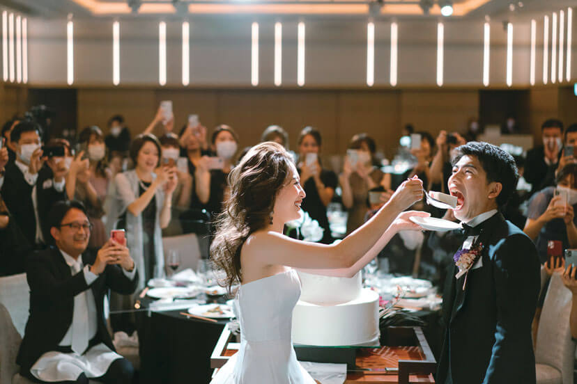 ウエディングケーキのカット&ファーストバイトは、ゲストのカメラがふたりを取り囲んだ。