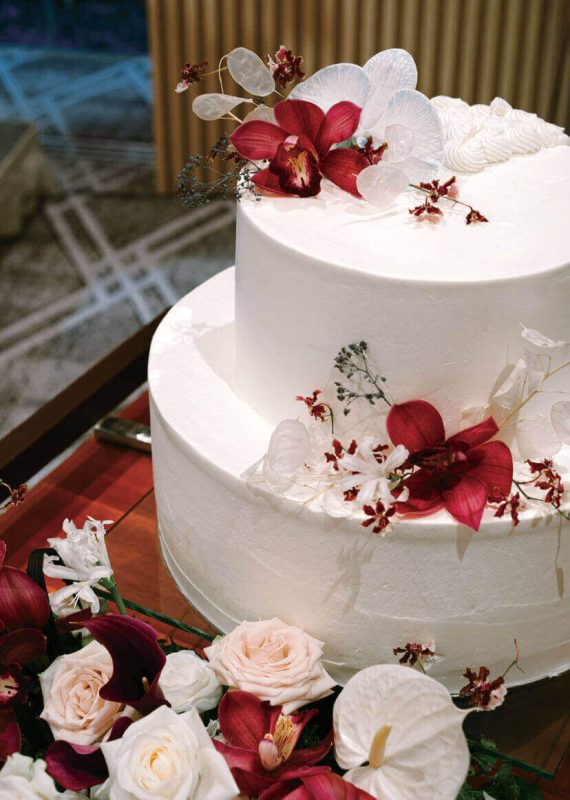 シンプルな2段のケーキに生花をあしらったデザインで会場とコーディネート。
