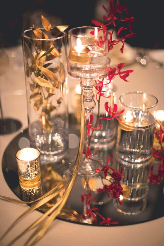 テーブル装花もゴールド×深いピンクで大人の雰囲気に。