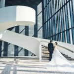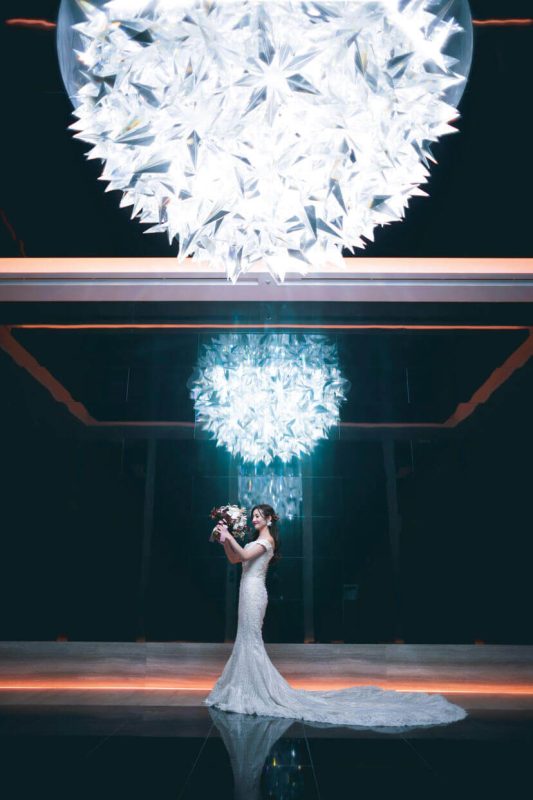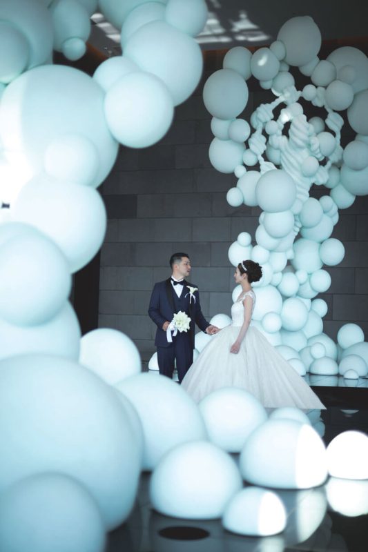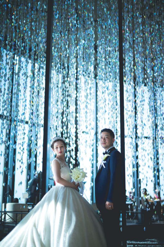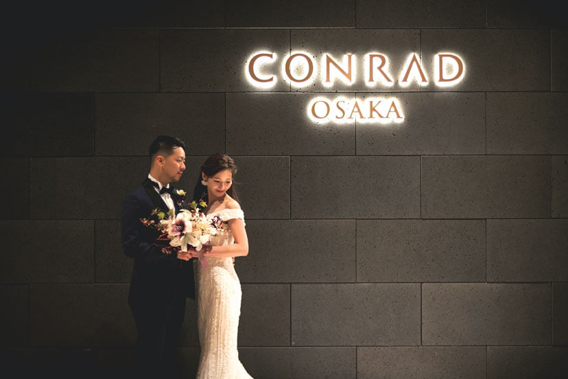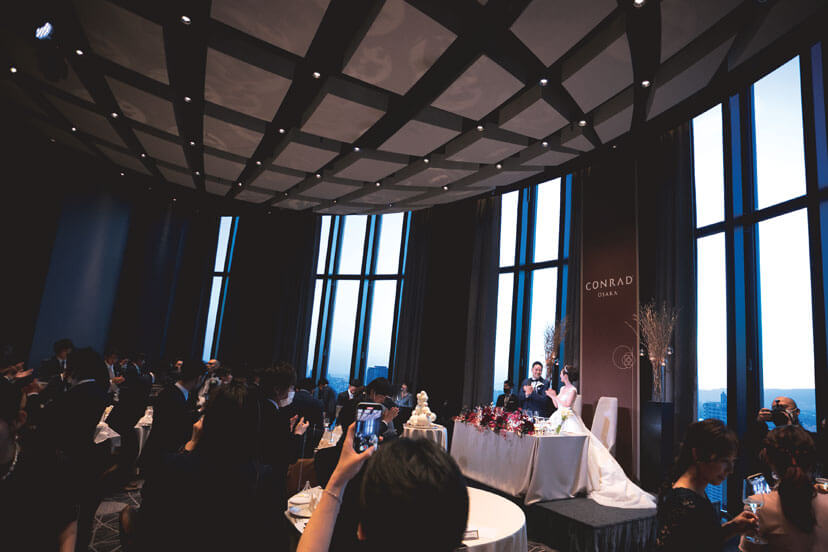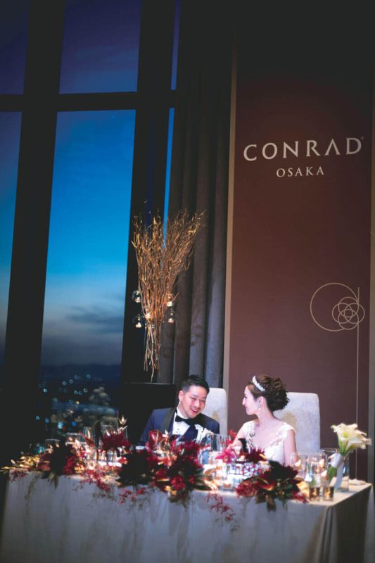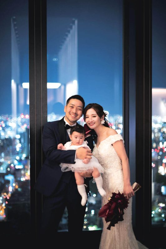 「コンラッド大阪」は、ふたりの思い出が詰まった場所。新婦は告白されたディナーの後に見た夜景が忘れられず、結婚式はここでと決めていた。こだわりは、夜景を満喫するナイトウエディングの演出。延期になった2年間にドレスを沢山試着し「満天の星空に似合うドレス」というコンセプトのグリッタードレスに出合えた。世の中がやっと落ち着き、晴れの日を迎えると当日は雲ひとつない晴天。まさに満天の星空の元、ゲストを圧倒するドラマティックな一夜を叶えた。挙式は爽やかなシティビューが広がる高層階のチャペルで。夕焼けがキレイな時間に合わせてパーティをスタートさせた。刻々と変わりゆく空を間近に、芸術的な料理でおもてなし。シーンに合わせてふたりで選曲したBGMと最新の音響照明、ここにしかない美しい夜景とホテルオリジナルのカクテルに、ゲストも酔いしれた。「結婚式が行えるのか不安が続くなか、やっとみんなで集まれたことが本当にうれしかった」と語るふたり。また愛娘も一緒に結婚式が行えたことも、最高の幸せとなった。