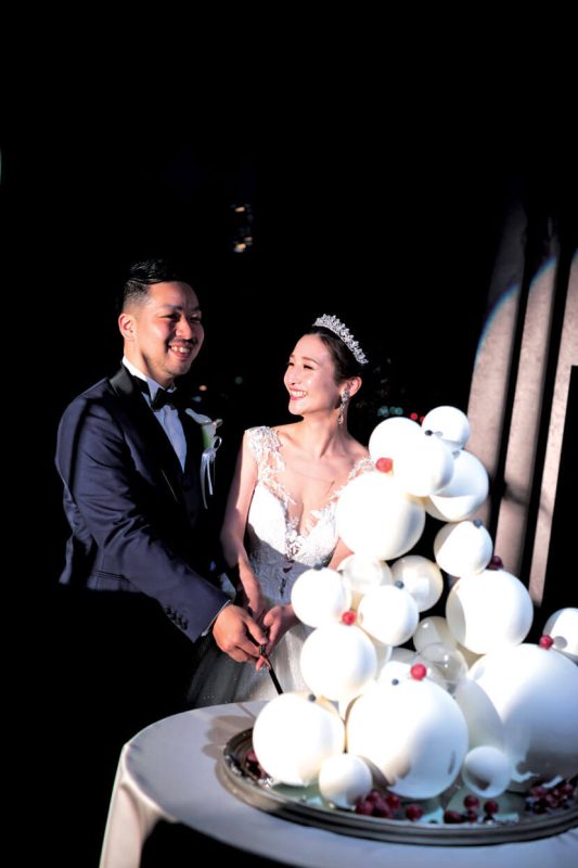 「コンラッド大阪」を象徴するアートを模ったウエディングケーキをオーダー。完成度の高さに感動したふたり。