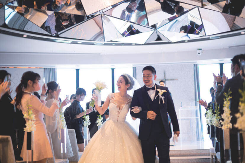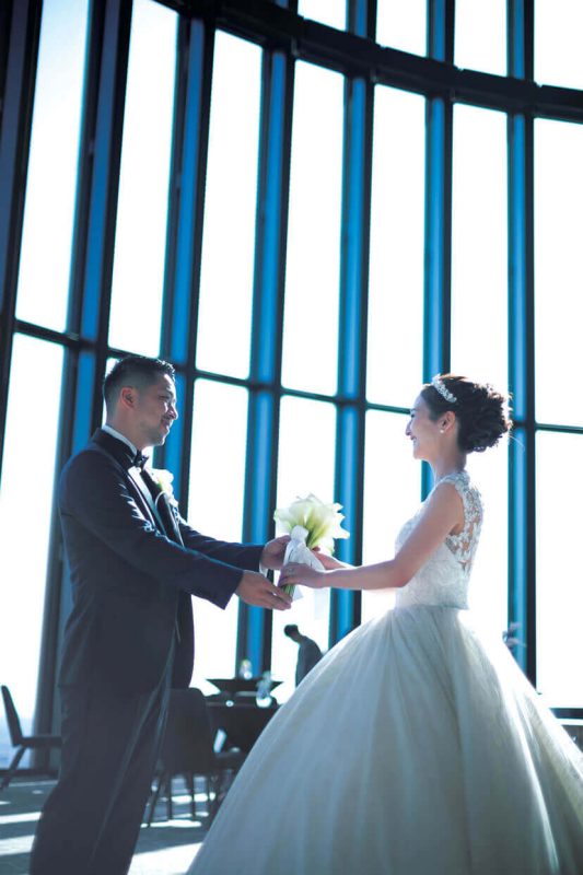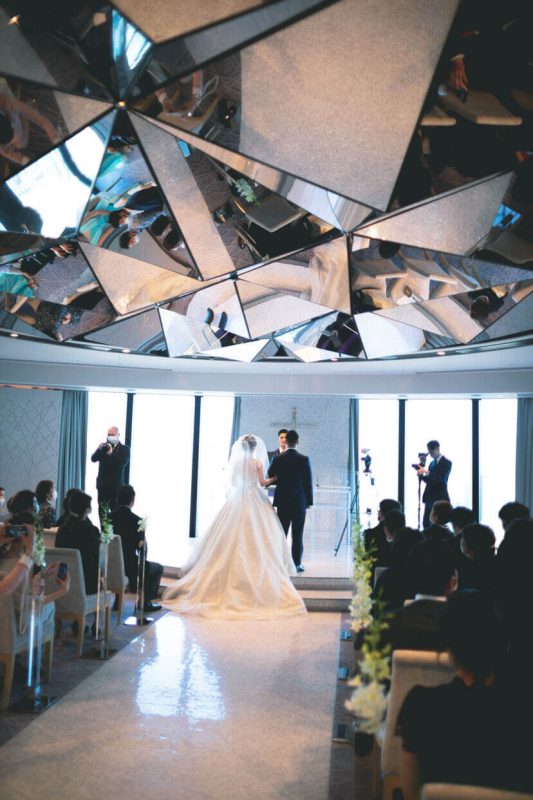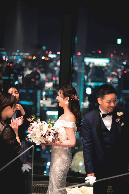 ふたりが入場し、祭壇のカーテンがオープン。街を見下ろす眺望にゲストから歓声が。
