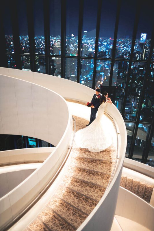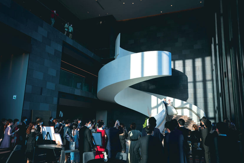 挙式後は、らせん階段からふたりが登場。撮影タイムを楽しんだ。