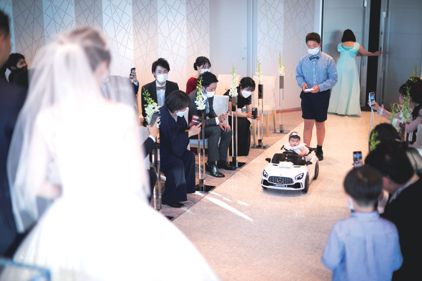 リングガールは小さな白いベンツに乗った愛娘。甥っ子がコントローラーで操作する姿もほっこりとした演出に。