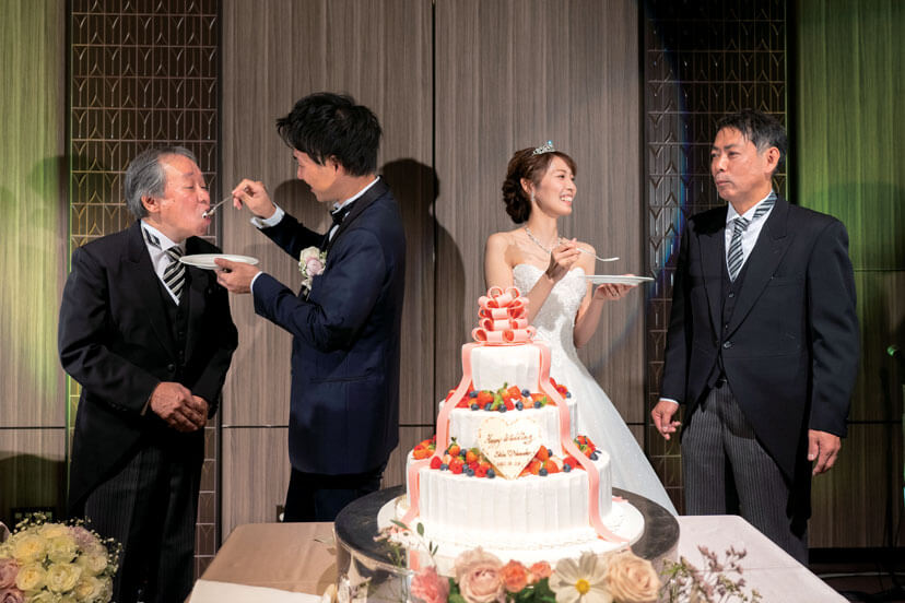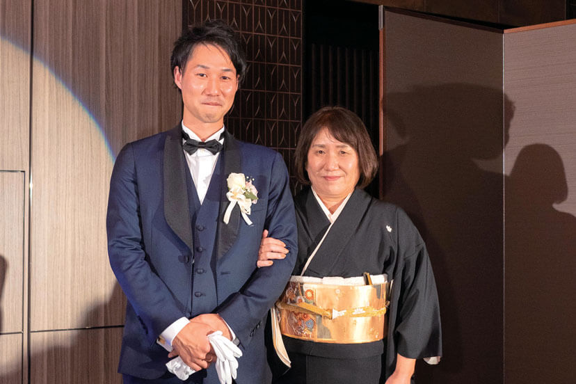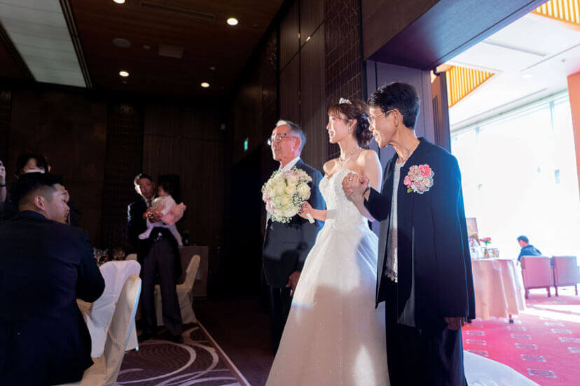 お色直しの中座の際、サプライズで新婦は祖父母、新郎は母がエスコート。これまで大切に育て、見守ってくれていたことに感謝を伝える意味でもさまざまなシーンで家族に登場してもらった。