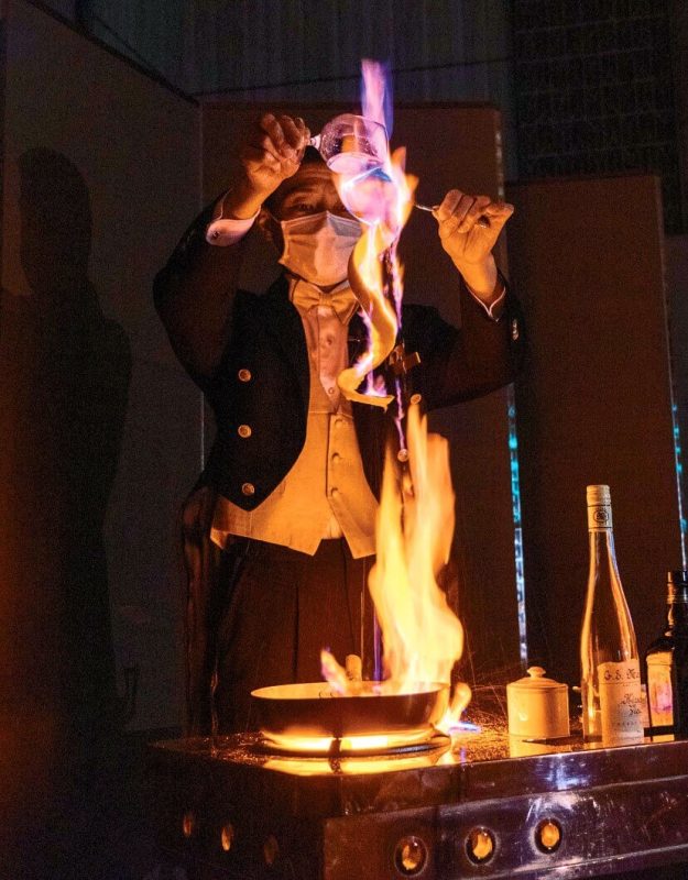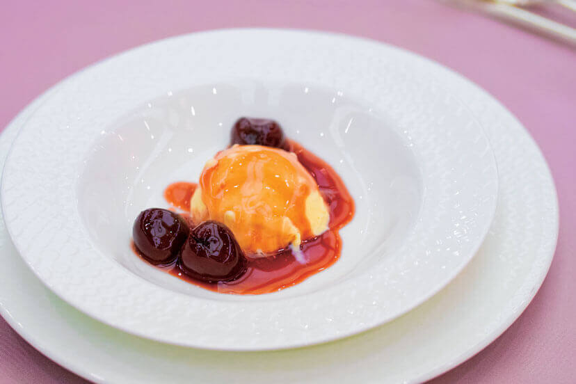 炎とリキュールの香りの演出も楽しいチェリージュビレのデザート。